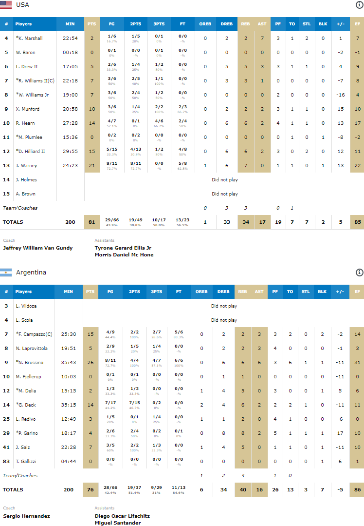 Jameel Warney termine avec 21 points à 8/11 et 7 rebonds et il est élu MVP de la compétition. Darrun Hilliard ajoute 15 points et Reggie Hearn 14. Côté argentin Nicolas Brussino score 26 points à 8/11 et Facunso Campazo ajoute 15 points. Ces deux derniers sont dans le 5 de la compétition tout comme Hilliard et le mexicain Francisco « Paco » Cruz.