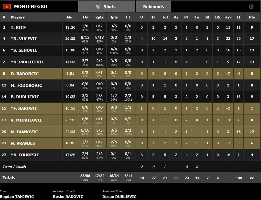 Quatre joueurs dont Nikola Ivanovic (17 points à 6/10) et Nikola Vucevic (17 points à 8/13 et 14 rebonds) terminent à au moins 10 points pour le Monténégro (16/34 à 3-points contre 8/21 pour leurs adversaires, devant de jusqu’à 28 points au cours de la rencontre.