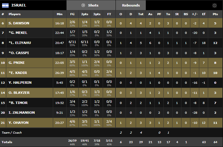 L’ancien NBAer Vyacheslav Kravtsov signe 17 points et 7 rebonds en 20 minutes, Ruslan Otverchenko ajoute 13 points. Côté Israël, Omri Casspi termine avec 3 points, tout comme Gal Mekel…
