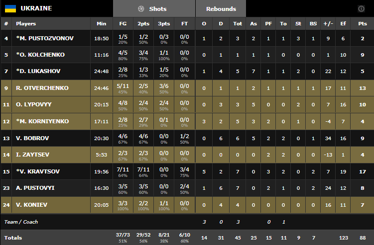 L’ancien NBAer Vyacheslav Kravtsov signe 17 points et 7 rebonds en 20 minutes, Ruslan Otverchenko ajoute 13 points. Côté Israël, Omri Casspi termine avec 3 points, tout comme Gal Mekel…