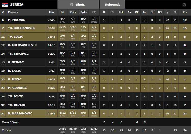 Déjà éliminés, les Belges ont fait tourner et n’ont pas fait le poids. Menés par Boban Markanovic (22 points à 8/12 et 7 rebonds en 22 minutes), Bogdan Bogdanovic (15 points) et Milan Macvan (10 points), les Serbes ont très rapidement fait le break en limitant les Belges à 25 points en première mi-temps. Après 10 minutes ils menaient de 5 points puis se sont envolés en seconde quart en virant en tête 42-25 à la pause. La seconde mi-temps a été une formalité pour les hommes de Sasha Djordjevic.
