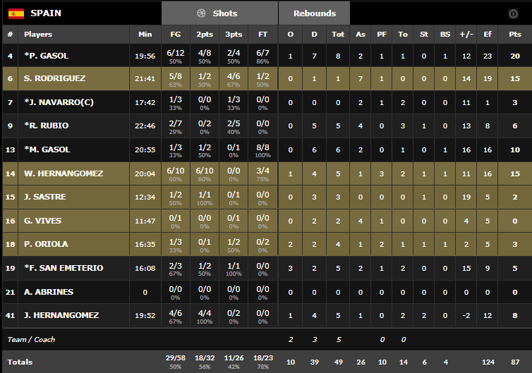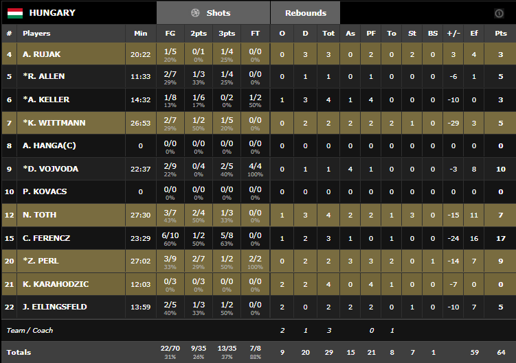 Sergio Scariolo a fait tourner son effectif et Willy Hernangomez a encore sorti un très bon match avec 15 points et 5 rebonds en 20 minutes tandis que Sergio Rodriguez compile 15 points et 7 passes. L’Espagne a commencé par un 16-5 en seulement 4’30 et a géré tranquillement le reste de la rencontre sans jamais s’envoler comme lors de ses 3 premiers matchs mais la Hongrie n’a jamais été en mesure de l’inquiéter, surtout en l’absence d‘Adam Hanga.