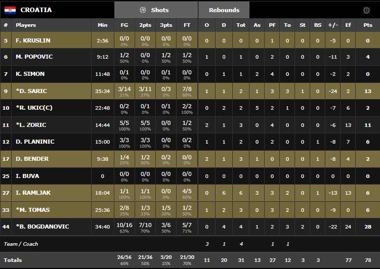 Encore une fois Alexey Shved a réalisé un très grand match avec 27 points et 12 passes, mais toute l’équipe russe a brillé avec une très belle performance offensive. Zubkov et Kulagin marquent 14 points, Fridzon 13, et Mozgov 10. En face Bojan Bogdanovic a été bien trop seul avec 28 points à 10/16 avec que Dario Saric sort un mauvais match (13 points à 3/14, 2 rebonds, 1 passe et 3 ballons perdus)