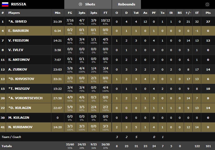 Encore une fois Alexey Shved a réalisé un très grand match avec 27 points et 12 passes, mais toute l’équipe russe a brillé avec une très belle performance offensive. Zubkov et Kulagin marquent 14 points, Fridzon 13, et Mozgov 10. En face Bojan Bogdanovic a été bien trop seul avec 28 points à 10/16 avec que Dario Saric sort un mauvais match (13 points à 3/14, 2 rebonds, 1 passe et 3 ballons perdus)