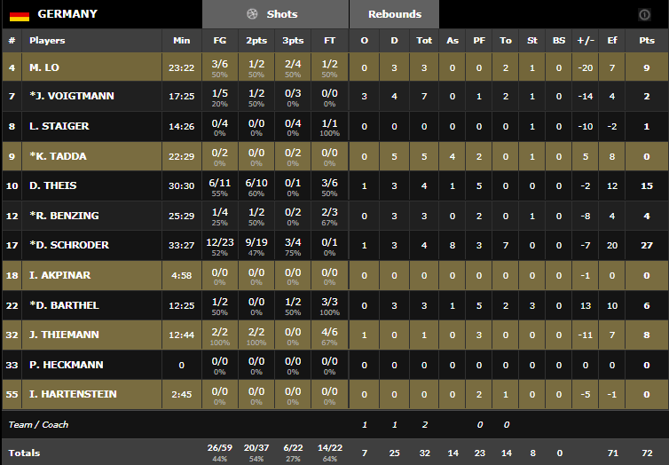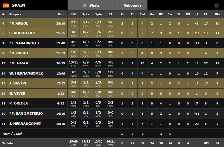 Marc Gasol est l’homme du match avec notamment 18 points inscrits en 3ème acte et 16 d’un 22-6 qui a fait la différence. Il termine avec 28 points à 10/15 dont 4/6 à 3-pts, 10 rebonds, 4 passes et 2 contres, alors que son frère Pau n’est pas en reste avec 19 points à 7/15. Sergio Rodriguez est encore une fois précieux (11 points et 7 passes). En face l’Allemagne n’a pas eu la même réussite avec un très moche 6/22 3-pts et Dennis Schröder compile 27 points à 12/23, 8 passes et 7 ballons perdus.