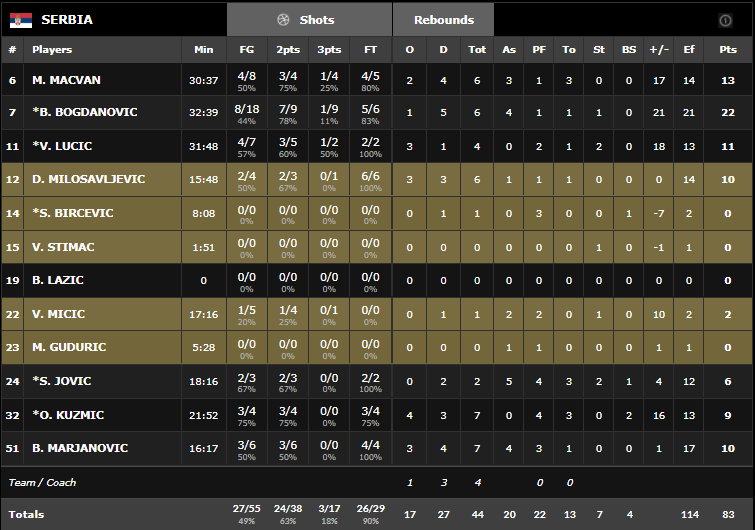 Les Serbes ont construit leur succès sur leur domination intérieure avec 44 rebonds à 19 dont 17 offensifs 44 points à 18 dans la raquette. Cela a compensé leur 8/29 à 3-pts. Maladroit, Bogdan Bogdanovic a pris ses responsabilités en dernier quart quand son équipe a eu besoin de plier le match. Il termine avec 22 points à 8/18, 6 rebonds et 4 passes. Il a été bien aidé par Milan Macvan (13 points, 6 rebonds et 3 passes), Vladimir Lucic (11 points) et Boban Marjanovic (10 points, 7 rebonds et 4 passes). En face Marco Belinelli n’a pas sorti un assez bon match pour permettre aux siens d’espérer. il signe 18 points à 5/17 dont un horrible 2/11 à 3-pts. Luigi Datome ajoute 15 points à 5/11.