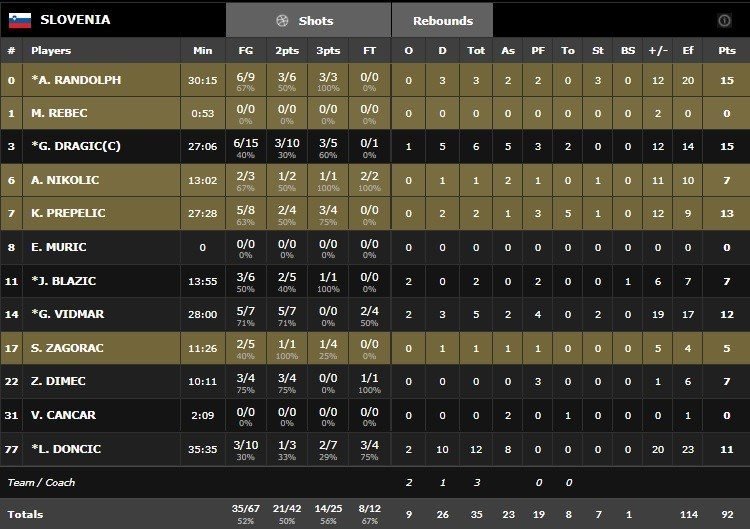Le 5 Goran Dragic (15 points, 6 rebonds et 5 passes), Luka Doncic (11 points à 3/10 mais 12 rebonds et 8 passes), Anthony Randolph (15 points à 6/9) Klemen Prepelic (13 points à 5/8) et Gasper Vidmar (12 points et 5 rebonds) a été énorme, bien épaulé par des joueurs inattendus comme Dimec et Zagorac. Ils shootent à 14/25 à trois points contre un très mauvais 7/27 espagnol. Ces derniers n’ont sans doute pas assez servis leurs intérieurs, bien défendus par les Slovènes. Pau Gasol signe 16 points à 6/15 et Marc Gasol ajoute 12 points à 3/9. Meilleure défense du tournoi, l’Espagne n’a jamais réussi à ralentir les Slovènes et la zone, essayée deux fois, a été à chaque fois sanctionnée.