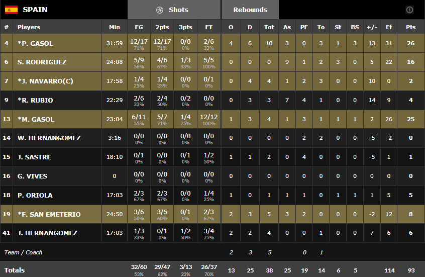 Le trio Pau Gasol (26 points à 12/17, 10 rebonds et 3 passes), Marc Gasol (25 points à 6/11) et Sergio Rodriguez (16 points à 5/9 et 9 passes) a été le grand artisan de ce succès. En face Alexey Shved a été bizarrement benché en dernier quart mais c’est sans lui que les Russes ont fait leur retour. Il termine avec 18 points à 6/12.