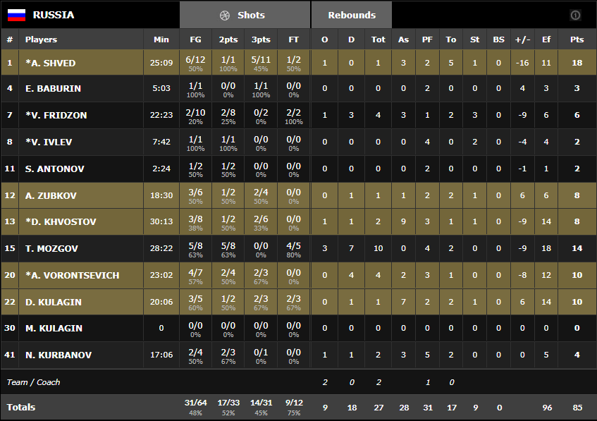 Le trio Pau Gasol (26 points à 12/17, 10 rebonds et 3 passes), Marc Gasol (25 points à 6/11) et Sergio Rodriguez (16 points à 5/9 et 9 passes) a été le grand artisan de ce succès. En face Alexey Shved a été bizarrement benché en dernier quart mais c’est sans lui que les Russes ont fait leur retour. Il termine avec 18 points à 6/12.