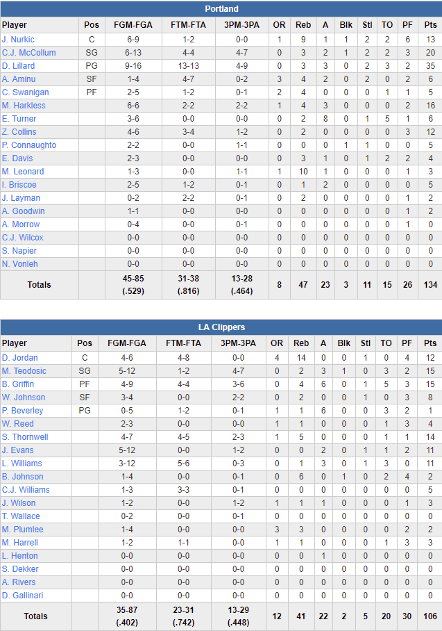 Les Blazers ont eux largement dominé les Clippers à Los Angeles avec un grand Damian Lillard, auteur de 35 points à 9/16 alors que CJ McCollum signe 20 points à 6/13, Jusuf Nurkic 13 points à 6/9 et 9 rebonds et Moe Harkless 16 points à 6/6. En face Blake Griffin et Milos Teodosic marquent 15 points chacun tandis que DeAndre Jordan compile 12 points et 14 rebonds.