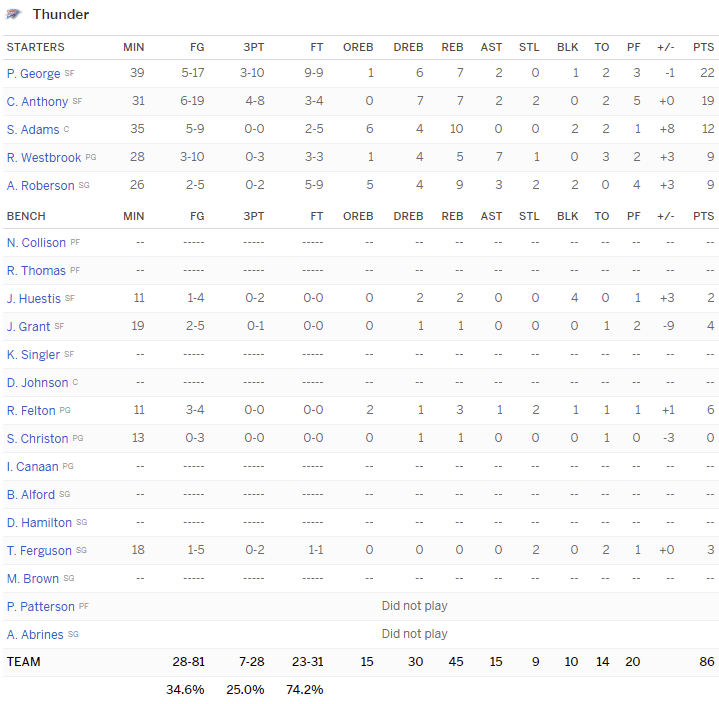 OKC affrontait les Australiens de Melbourne et a eu le plus grand mal à s’imposer. Tout s’est joué dans le money time, et Melbourne a eu plusieurs occasions de passer devant, notamment sur la dernière possession. Le second 5, mené par Paul George, a finalement eu le dernier mot grâce à deux gros contres de Josh Huestis. Russell Westbrook signe 9 points à 3/10, 5 rebonds et 7 passes en 28 minutes, Paul George 22 points à 5/17 et Carmelo Anthony 19 points à 6/19.