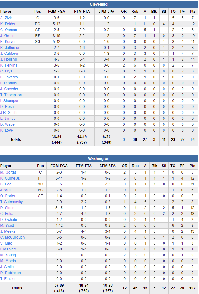 Plusieurs match avaient lieu en début de soirée, dont une affiche intéressante sur le papier entre les Wizards et les Cavaliers. Mais voilà, ces derniers étaient sans LeBron James, Derrick Rose, Dwyane Wade et Kevin Love, et se sont encore inclinés. Les Wizards l’emportent 102-94 avec 12 points de Kely Oubre Jr., 11 de Bradley Beal et 6 points à 2/6 de John Wall. En face Jeff Green (19 points à 8/15 et 7 rebonds) et Kay Felder (12 points et 11 passes) se sont imposés.
