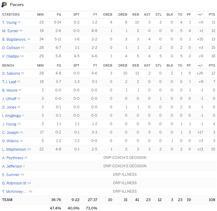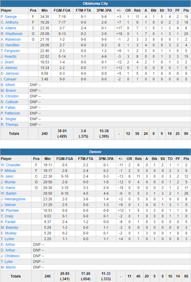 Nouvelle sortie gagnant pour le trio du Thunder, cette fois plus convaincant avec 20 points et 7 passes de Russell Westbrook, 19 points, 11 rebonds, 4 passes et 5 interceptions de Paul George et 16 points et 9 rebonds de Carmelo Anthony