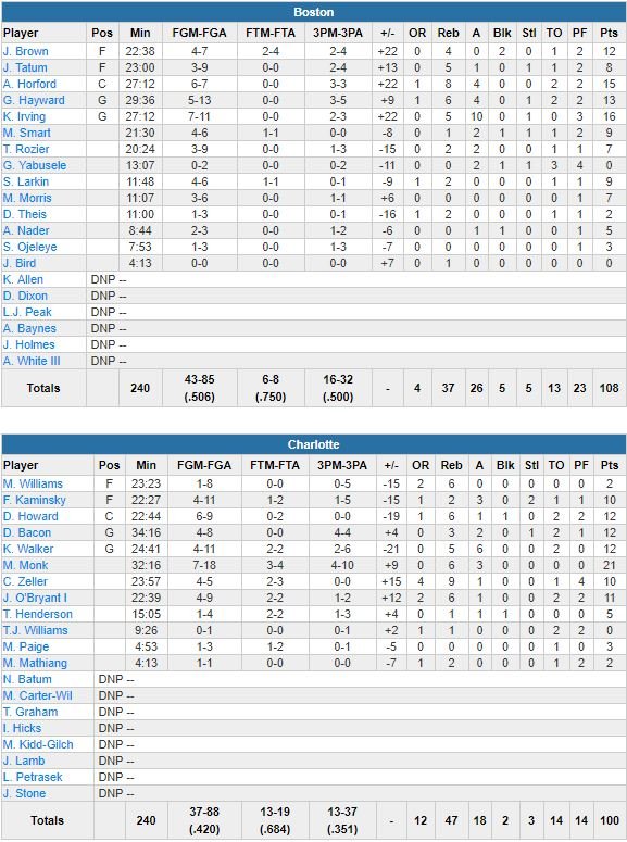Kyrie Irving a lui joué 27 minutes et signé 16 points à 7/11, 5 rebonds et 10 passes dans la victoire des Celtics sur Charlotte (21 points à 6/18, 6 rebonds et 3 passes pour Malik Monk en 32 minutes). Gordon Hayward signe lui 13 points à 5/13, 6 rebonds et 4 passes en 29 minutes.