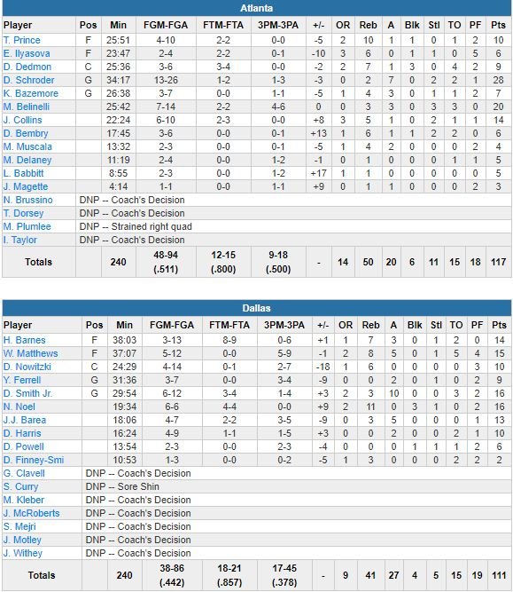 Dirk Nowitzki, seul joueur avec Kobe Bryant à atteindre les 20 saisons NBA sous le même maillot, signe 10 points à 4/14 mais n’a pas joué les dernières minutes serrées de la rencontre. Ainsi à 58 secondes du buzzer, Dewayne Dedmon (9 points à 3/6 et 7 rebonds) rentre un layup après un manqué de Schröder pour donner 2 points d’avance aux Hawks (50 rebonds à 41), 113-111. Taurean Prince (10 points à 4/10 et 10 rebonds) a ensuite pris un rebond offensif clutch suite à un 3-points raté de Belinelli avant d’obtenir et de rentrer 2 lancers-francs pour le +4.