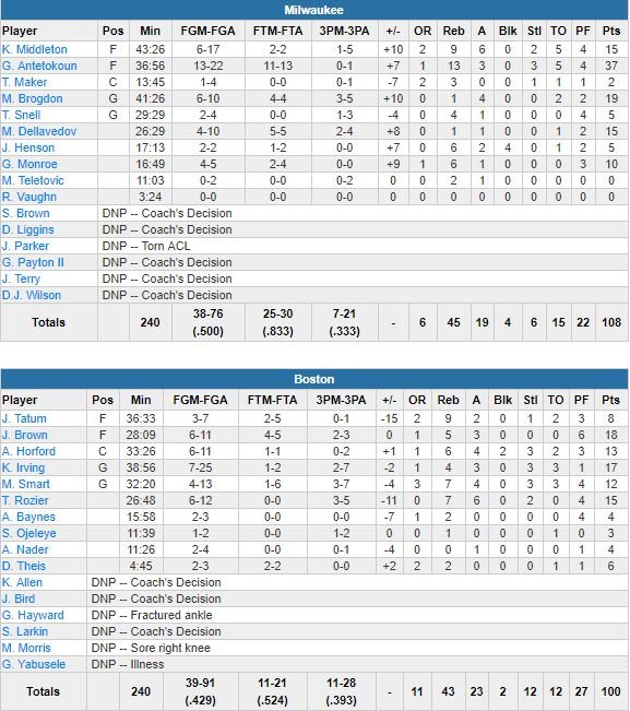 Menés de 7 points en début de 3ème quart-temps, les hommes de Brad Stevens ont ensuite bien réagi en inscrivant 14 des 16 points suivants pour passer devant 69-64 sur un 3-points d’Irving. Mais à 6 minutes de la fin de la période et après avoir empêché ses adversaires de marquer pendant près de 5 minutes, Milwaukee, qui dominera le dernier quart 32-20, est repassé devant malgré un 27-18 encaissé dans le 3ème.
