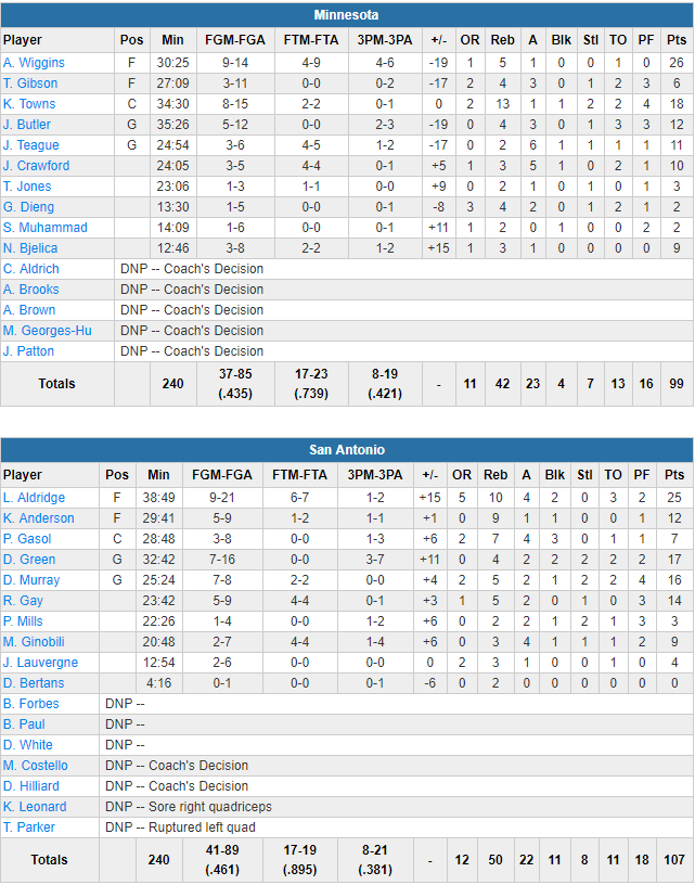 Malgré les absences de Kawhi Leonard et Tony Parker, les San Antonio Spurs ont dominé les très attendus Minnesota Timberwolves sur le score de 107-99. LaMarcus Aldridge, leader des Spurs de fait, a réalisé un très bon match avec 25 points à 9/21, 10 rebonds pour permettre aux Texans de repousser le retour des Wolves en fin de rencontre.