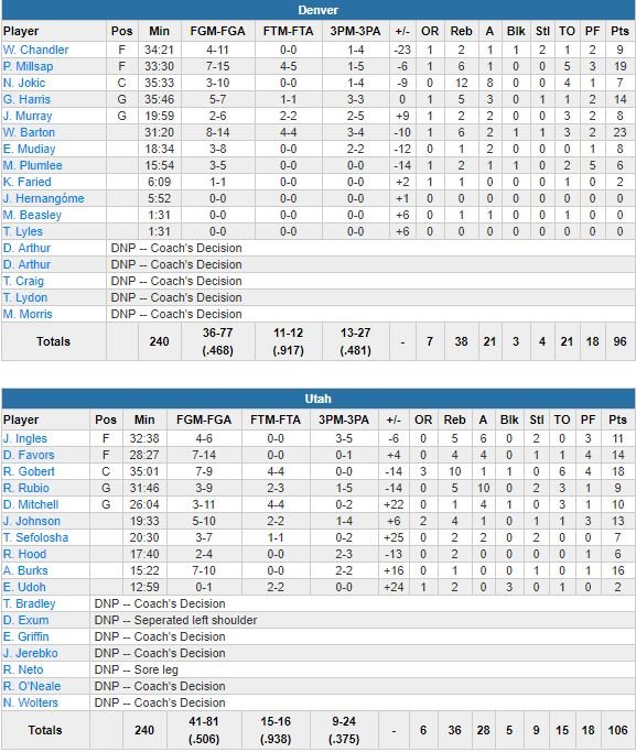 À noter : Jamal Murray (8 points à 2/6) était titulaire à la mène pour Denver, devant Emmanuel Mudiay (8 points à 3/8). Le rookie Donovan Mitchell a pu démarrer son premier match NBA en tant que titulaire puisque Rodney Hood, malade, n’est rentré qu’en fin de premier quart. Il termine à 10 points à 3/11 et 4 passes.