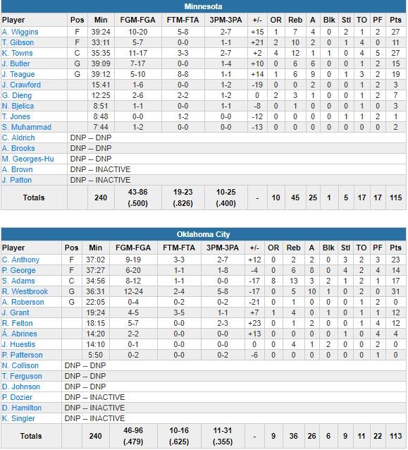 À noter : Jeff Teague termine à 19 points à 5/10, 6 rebond et 9 passes, Jimmy Butler 15 points à 7/17, 6 rebonds et 6 passes. Raymond Felton et Jerami Grant signent tous deux 12 points en sortie de banc pour le Thunder.