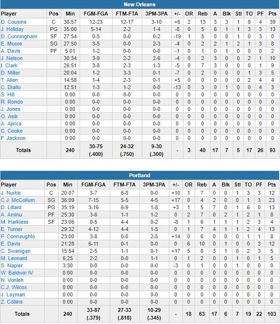 Orphelins d’Anthony Davis, touché au genou gauche (contact genou à genou avec Mo Harkless et premiers examens rassurants) dès les premiers instants du match et qui a joué 5 minutes, les Pelicans s’en sont remis en vain à un DeMarcus Cousins (39 points à 12/23, 13 rebonds, 3 passes et 3 contres) en double-double pour la 4ème fois consécutive mais dont l’équipe s’incline pour la 3ème fois en 4 matchs. Monté jusqu’à +13 en 1ère mi-temps, les Blazers vont se retrouver menés 48-47 à la mi-temps. Cousins compte alors 13 points et 9 rebonds.