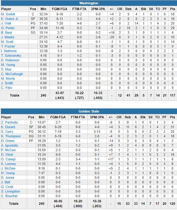 À noter : les Warriors ont démarré leur match sur un 1/10 à 3-points. Ils terminent à 10/38, contre 15/33 pour Washington. Otto Porter Jr. termine meilleur marqueur de son équipe avec 29 points à 11/16 et 10 rebonds. Incertain avant le match, Ian Mahinmi a joué 13 minutes (2 points à 1/3 et 3 rebonds).