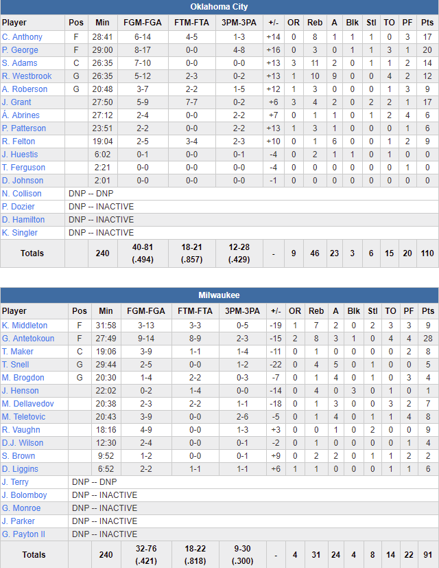 A la baguette Russell Westbrook s’est encore régalé avec 12 points à 5/12, 10 rebonds et 9 passes alors que Paul George (20 points à 8/17), Carmelo Anthony (17 points à 6/14) et Steven Adams (14 points et 11 rebonds) se chargeaient de la conclusion. Jerami Grant ajoute lui 17 points en sortie de banc. Côté Bucks, en difficulté face à la défense d’OKC, seul Giannis Antetokounmpo surnage avec 28 points à 9/14 et 8 rebonds mais il est le seul à au moins 10 points.