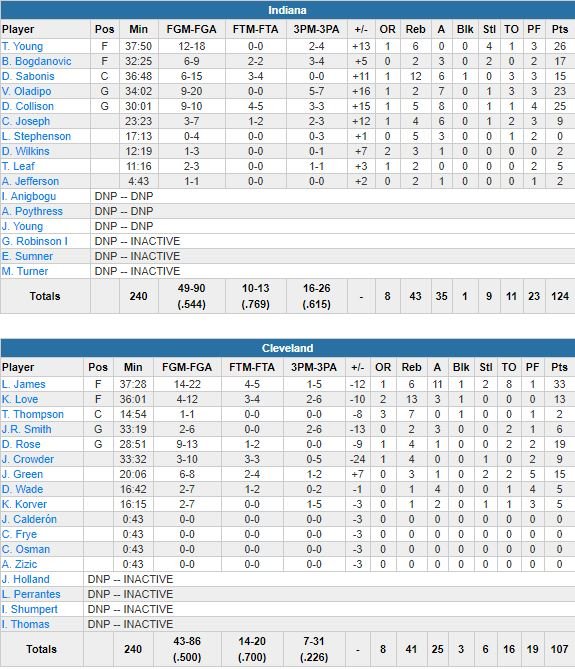 En face LeBron James (34 points à 14/22, 6 rebonds, 11 passes mais aussi 8 ballons perdus), Derrick Rose (19 points à 9/13, 4 rebonds), Jeff Green (15 points à 6/8) et Kevin Love (13 points à 4/13 et 13 rebonds) ont tenu une mi-temps avant d’encaisser un 5ème revers en 6 matchs (61 points de retard cumulés sur leur série de 4 défaites). En retard de seulement 1 point (69-68) dans le 3ème quart, les Cavs (2ème pire équipe au nombre de 3-points encaissés avant le match) vont encaisser 4 tirs à 3-points consécutifs et laisser Indiana (62-46 en seconde mi-temps) prendre 8 points, puis jusqu’à 17 points d’avance.