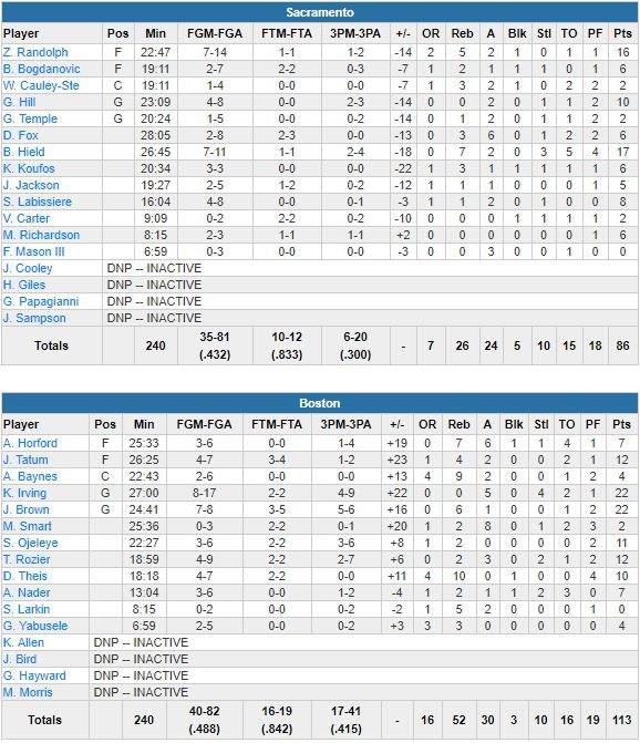 Ça fait 6 de suite pour les Celtics, vainqueurs 113-86 ds Kings au TD Garden cette nuit, avec 22 points à 7/8 et 6 rebonds de Jaylen Brown et 22 points à 8/17, 5 passes et 4 interceptions de Kyrie Irving, qui n’ont respectivement eu à jouer que 22 et 27 minutes.
