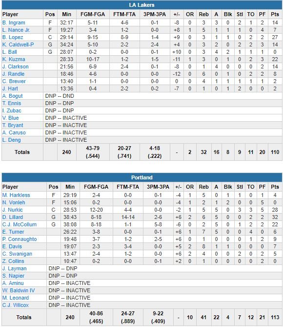 Brook Lopez signe 27 points à 9/15 pour des Lakers qui ont perdu Larry Nance Jr. (blessé à la main, 11.1 points et 7.9 rebonds de moyenne cette saison) en cours de route et qui n’ont pas du tout pu compter sur Lonzo Ball, bloqué à 0 point à 0/2, 3 rebonds et 4 passes en 28 minutes de jeu. Le match avait démarré fort en faveur des Blazers avec un avantage 35-23 sur un 3-points de Pat Connaughton. C.J. McCollum (22 points) inscrit 13 points à 3/4 à 3-points dans la période et Portland prend jusqu’à 18 points d’avance. Mais avec 11 points en 13 minutes de Kuzma, les Lakers passent un 37-25 aux locaux dans le 2ème quart et se remettent dans le match et ne comptent plus que 4 points de retard à la mi-temps, 66-62. Au final les hommes de Luke Walton domineront la 2ème mi-temps d’un petit point (48-47) mais payent donc aussi leurs errances de début de match à la fin.