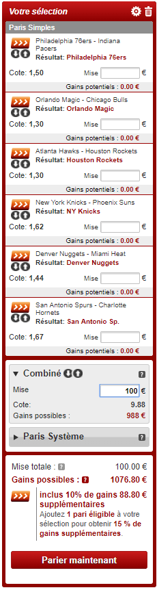 En vous inscrivant ici chez notre partenaire Betclic, votre premier pari est remboursé à hauteur de 100€*, pourquoi ne pas en profiter pour flamber un peu puisque vous ne risquez rien. Aujourd’hui il y a 12 matchs au programme et on va tenter notre chance sur un gros combiné, avec 6 rencontres. Forcément c’est risqué mais c’est le but du premier pari remboursé et pour maximiser nos chances de gagner on a sélectionné 6 matchs qui nous semblaient les moins indécis. On va ainsi miser sur des succès des Sixers (contre Pacers), Spurs (contre Hornets), Rockets (contre Hawks), Knicks (contre Suns), Nuggets (contre Heat) et Magic (contre Bulls). Cela nous donne une superbe cote à 9.8 (elle peut varier), avec des victoires dans le temps réglementaire de ces équipes, avec en plus un bonus de 10% qui fait monter le gain potentiel à 976.8€ en posant les 100€ du 1er pari gratuit.