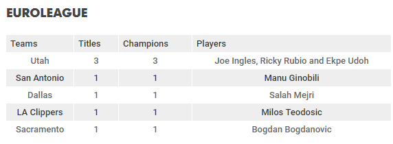 - Le Jazz est aussi une équipe très internationale puisqu’elle compte dans ses rangs 3 vainqueurs de l’Euroleague : Joe Ingles, Ricky Rubio et Ekpe Udoh