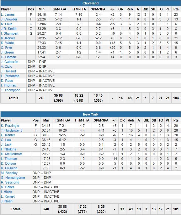 Cleveland, qui a rentré plus de 3-points dans les 12 dernières minutes (9) que les Knicks (28 points et 10 rebonds de Tim Hardaway Jr., 20 points et 16 rebonds d’Enes Kanter et 20 points à 7/21 et 7 rebonds de Kristaps Porzingis) n’ont mis de paniers (8) s’impose au passage pour la 8ème fois consécutive à New York. Mais c’est en fin de 3ème quart-temps que le match a commencé à tourner en faveur des visiteurs (revenus à 15 points avant de jouer le dernier quart), grâce à leurs remplaçants.