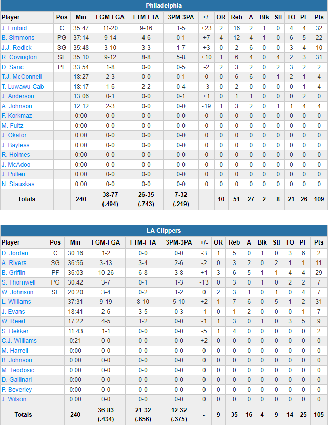 Le trio Joel Embiid (32 points à 11/20 et 16 rebonds), Robert Covington (31 points à 9/12 dont 5/8 à 3-pts) et Ben Simmons (22 points à 9/14, 12 rebonds et 4 passes) a fait des misères aux locaux. Si les 76ers ont perdu 21 ballons, ils ont compensé avec une meilleure adresse (49.4% contre 43.4%) et capté 10 rebonds offensifs. En face Lou Williams (31 points à 9/19) et Blake Griffin (29 points à 10/26 ont été un peu trop seuls).