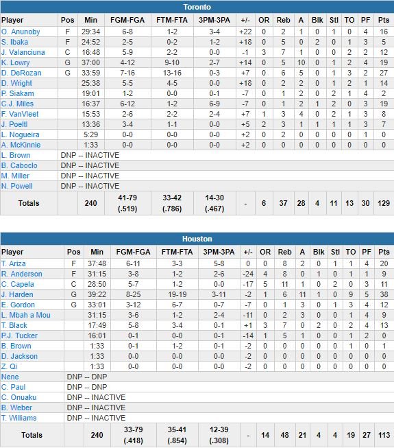 James Harden (38 points à 8/25, 19/19 aux lancers-francs, 6 rebonds, 11 passes, 9 ballons perdus) et les siens ont pris jusqu’à 8 points d’avance en première mi-temps mais se sont retrouvés menés de 12 points (76-64) à la pause après avoir encaissé 45 points (45-31) dans le deuxième quart-temps. Toronto enfonce ensuite le clou en inscrivant les 5 premiers points du troisième quart (81-64) et prennent jusqu’à 21 points d’avance avant la réaction des locaux. Après un 5-0 puis un 9-3 (avec 4 points d’Harden), l’équipe de Mike D’Antoni revient à 10 points, 97-87. À l’entame du dernier quart, Toronto reste devant 103-94. Les Rockets se rapprochent un peu plus grâce à un nouveau run (6-0, dont 3 lancers d’Harden), 108-103 à 7 minutes et demi de la fin. Toronto passe 3 minutes sans panier avant un 3-points d’OG Anunoby à 6’25. Puis après un layup de Delon Wright, Lowry vole le ballon à Harden et DeRozan s’offre un dunk de l’autre côté, 116-103. Harden relance encore un peu les siens grâce à un 3+1 mais DeRozan et Serge Ibaka lui répondront pas un dunk chacun pour le +13 à 3 minutes du buzzer, game over.