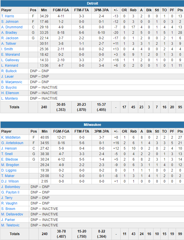 Les Pistons ont été stoppés à Milwaukee par le duo Khris Middleton (27 points à 12/21 et 8 passes) – Giannis Antetokounmpo (21 points et 6 rebonds). Puis Milwaukee réussit pas moins de 16 contres, à 2 du record de franchise. Les Pistons sont revenus après avoir 15 points de retard mais Eric Bledsoe a marqué 4 points de suite dans la dernière minutes alors que les visiteurs avaient égalisé. Avery Bradley termine avec 28 points à 8/18 dont 6/10 à 3-pts.