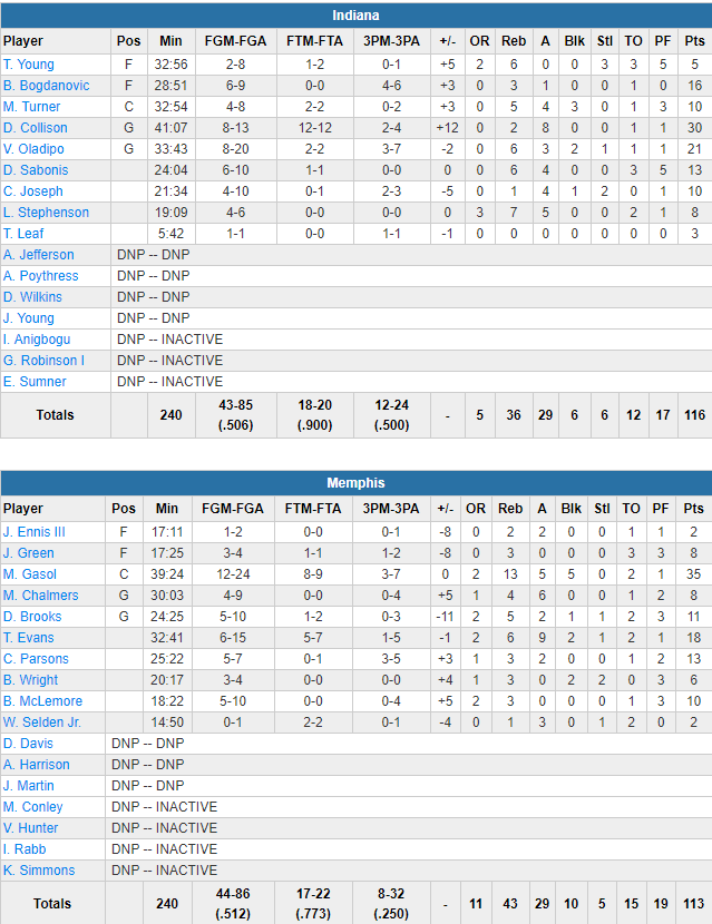 Les Pacers créent la surprise en s’imposant dans le Tennessee face aux Grizzlies. Ils ont été menés par les 30 points à 8/13 et 8 passes de Darren Collison alors que Victor Oladipo en ajoute 21 points. En face Marc Gasol marque pourtant 35 points à 12/24 en plus de 13 rebonds, 5 passes et 5 contres. Indiana a compté jusqu’à 17 points d’avance en dernier quart et a tenu malgré le retour des locaux.