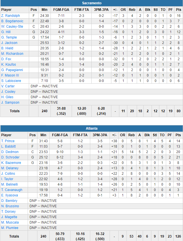 Les Hawks ont pulvérisé les Kings de 46 points avec 8 joueurs à au moins 10 points dont 20 points à 9/10, 14 rebonds et 5 passes de Dewayne Dedmon en 24 minutes et 21 points à 8/12 et 8 passes de Dennis Schröder. Atlanta shoote à 63.3% contre 35.2% aux Kings.