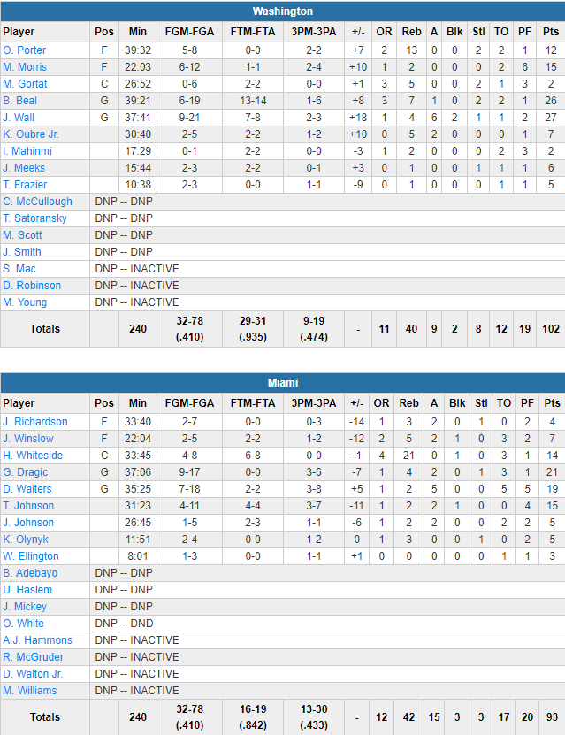 Sous l’impulsion de John Wall (27 points à 9/21 et 6 passes) et Bradley Beal (26 points à 6/19 et 7 rebonds) les Wizards ont dominé le Heat 102-93.
