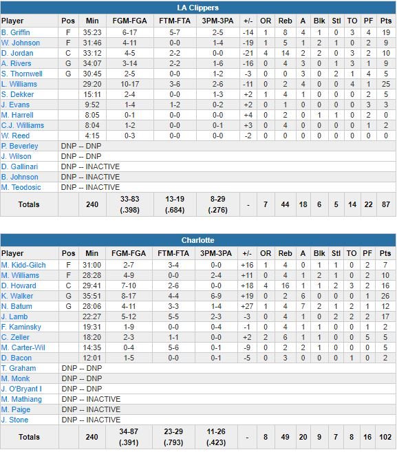 À noter : Charlotte (11/26 à 3-points contre 8/29) n’a perdu qu’un seul ballon en première mi-temps. DeAndre Jordan termine à 10 points et 14 rebonds. Michael Carter-Williams (7 points à 2/7, 4 rebonds) était de retour après 2 matchs manqués et Malik Monk n’a pas joué. Dominés 25-18 dans le 3ème, les Hornets ont ensuite passé un 29-16 aux Clippers dans les 12 dernières minutes.