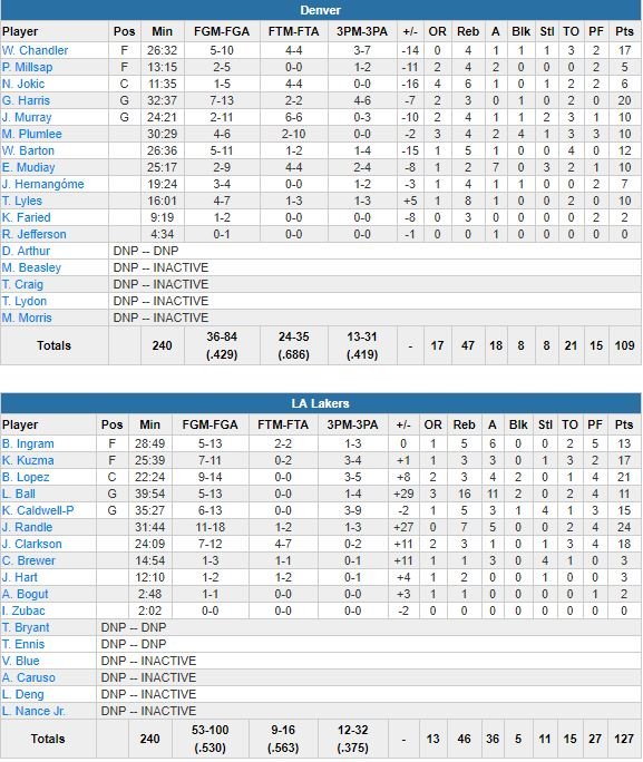 À noter : Denver a été tenu à 48 points en 1ère mi-temps et perd 21 ballons sur le match, dont 13 sur les 2 premiers quarts. Les Lakers ont fait autant de passes que les Nuggets ont réussi de paniers (36).