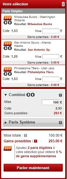 Pour le pari un peu moins risqué mais risqué quand même, on va miser sur un petit combiné avec des victoires de Milwaukee et San Antonio à la maison face à Washington et Atlanta et un succès des 76ers sur le Jazz, à domicile également.