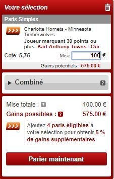 Au vu de la cote de 5.75 (elle peut varier) on va miser les 100€ du pari remboursé sur un match à au moins 30 points de Towns, avec un gain potentiel de 475€