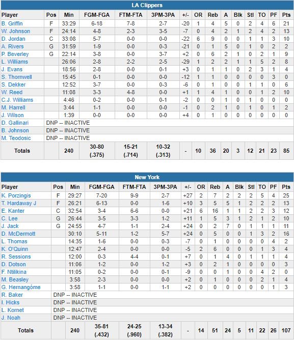 Les soirées se suivent et se ressemblent pour les Clippers, battus pour la 9ème fois consécutive cette nuit par des Knicks solides, 107-85. Kristaps Porzingis (25 points à 7/20, 7 rebonds, 2 passes, 2 contres, 2 interceptions) a dominé Blake Griffin (21 points à 6/18, 4 rebonds, 5 passes, 2 interceptions, sorti pour 6 fautes à 4’46) et permis à New York de mettre fin à une série de 10 défaites contre les Clippers.