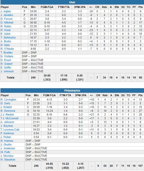 À noter : Utah a été limité à 35.3%. Alec Burks termine à 1/10 aux tirs et l’équipe n’a plus gagné deux matchs consécutifs depuis le 1er novembre. Simmons a shooté à 11/15 après la mi-temps. J.J. Redick termine à 20 points, Amir Johnson prend 13 rebonds. Jerryd Bayless était de retour opur les Sixers (3ème victoire en 4 matchs) après 6 matchs d’absence (poignet) et termine à 5 points. Phila n’a encaissé que 36 points en 1ère mi-temps.