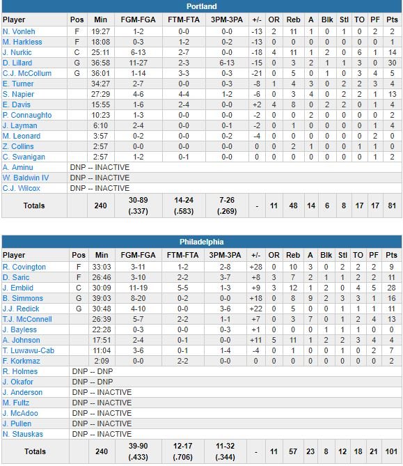 Promenade de santé pour les Sixers, opposés à Portland cette nuit. Joel Embiid (28 points à 11/19, 12 rebonds, 2 contres), accompagné par 4 coéquipiers à au moins 10 points dont Ben Simmons (16 points à 8/20, 8 rebonds, 9 passes, 2 contres et 3 interceptions), a mené son équipe à un succès 101-81. Philadelphie a lancé son match sur un 16-0, mené de 13 points à la mi-temps puis de 16 dans le 3ème.