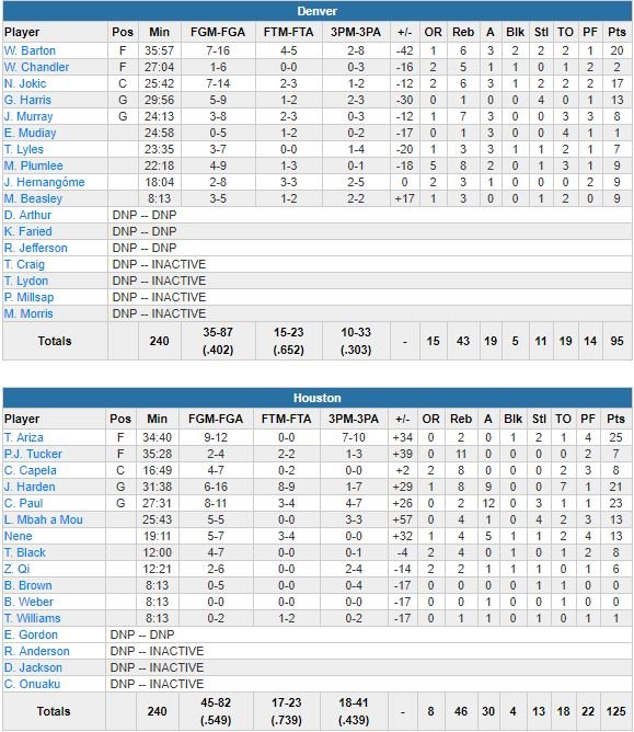 Houston, devant 75-40 à la mi-temps (plus gros écart de la saison en faveur des Rockets après deux quarts-temps), n’a jamais été inquiété dans ce match. Pour son 2ème match sans Paul Millsap (opération du poignet), les Nuggets se sont fait une belle frayeur lors d’une chute de Nikola Jokic (17 points à 6/14, 6 rebonds, 3 passes) en milieu de 2ème quart-temps. Le Serbe a néanmoins heureusement fait son retour au jeu en fin de période. Will Barton termine meilleur marqueur des perdants avec 20 points, Gary Harris signe lui 13 points. Wilson Chandler, absent lors de la victoire à Sacramento lundi en raison de douleurs au dos, était de retour en tant que remplaçant de Millsap dans le 5 mais termine à 2 points à 1/6 et 5 rebonds. Côté Rockets, P.J. Tucker a starté à la place d’Anderson pour 7 points à 2/4 et 11 rebonds et Luc Mbah a Moute a signé 13 points derrière Paul. Le Camerounais a signé le meilleur plus/minus de ces 20 dernières saisons (playoffs inlcus) : +57 (Houston a « outscoré » Denver de 57 points lorsqu’il était sur le terrain).
