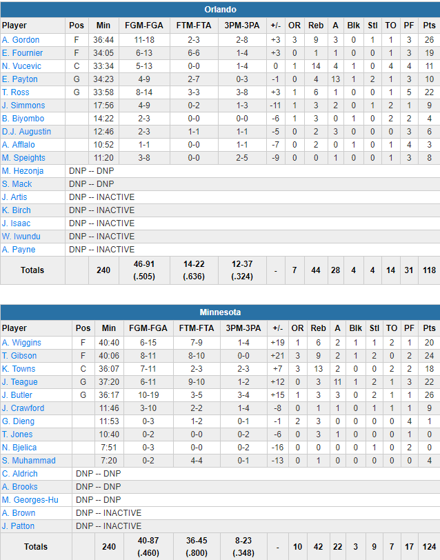Minnesota a construit son succès sur un énorme troisième quart, remporté sur le score cinglant de 41-18 sous l’impulsion d’un 5 majeur qui a fait le job en marquant 110 des 124 points sur le match. Jimmy Butler compile 26 points à 10/19, Taj Gibson 24 points et 9 rebonds, Jeff Teague 22 points et 11 passes, Andrew Wiggins 20 points et 6 rebonds et enfin Karl-Anthony Towns 18 points et 13 rebonds. Si Minnesota ne shoote qu’à 46% face aux 50.5% du Magic, ils ne perdent que 7 ballons, prennent 10 rebonds offensifs rentrent 22 lancers de plus. Côté Magic, on n’arrête plus hémorragie malgré 26 points d’Aaron Gordon et 22 points de Terrence Ross. Evan Fournier signe 19 points à 6/13.