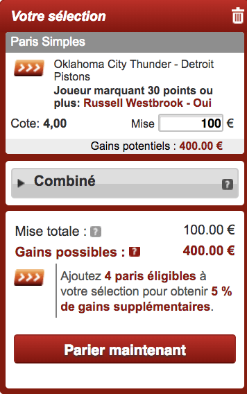 Au vu de la cote de 4.00 (elle peut varier) on va miser les 100€ du pari remboursé sur un match à au moins 30 points de Russell Westbrook, avec un gain potentiel de 300€