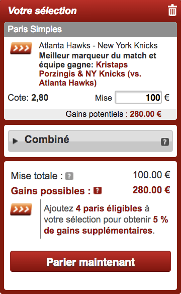 On va donc miser les 100€ du pari remboursé sur une cote à 2.80 (elle peut varier) pour une victoire des Knicks avec Kristaps Porzingis comme meilleur scoreur, pour un gain potentiel de 180€.