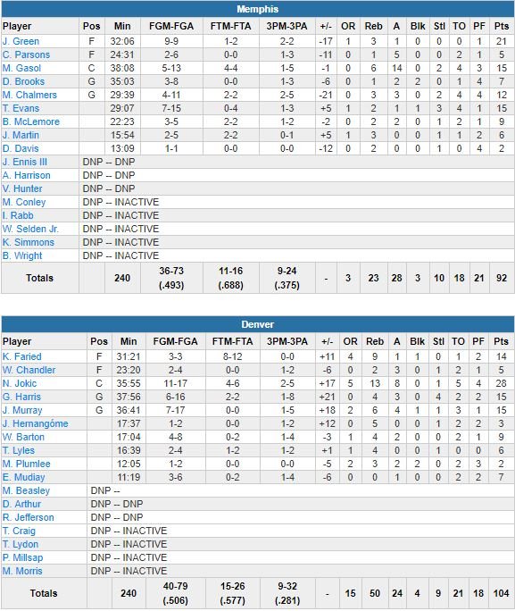 Nikola Jokic a endossé le rôle du « finisher » cette nuit dans la victoire 104-92 des Nuggets face à Memphis. L’intérieur a marqué 14 de ses 28 points dans le dernier quart et capté un total de 13 rebonds en plus de 8 passes décisives. Ses coéquipiers Gary Harris et Jamal Murray ajoutent 15 points chacun, Kenneth Faried 14 et Denver remporte une 5ème victoire d’affilée à domicile. Menée de 16 points à la mi-temps, les Grizzlies (21 points de JaMychal Green) avaient réussi à réduire l’écart à 2 points avant de jouer les 12 dernières minutes grâce à un 29-15 (dont un 11-0) dans le 3ème quart. Les locaux se sont repris en remportant le dernier quart 28-18. Memphis perd là un 7ème match consécutif.